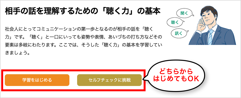 まず、学習コンテンツを読みたい場合は、「学習をはじめる」を選択するか「『聞く』『聴く』『訊く』の違い」などのコンテンツタイトルを選択してください。