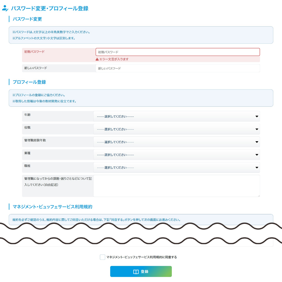 利用規約をご確認いただき、ご同意いただける場合は、「マネジメント・ビュッフェサービス利用規約に同意する」にチェックを入れ、「登録」ボタンを押してください。