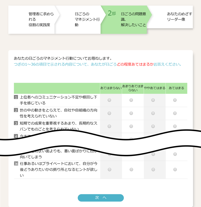 4. 「2部」では、日ごろのマネジメント行動についての問題意識や解決したいことについて確認します。各質問について「あてはまる」から「あてはまらない」までの4段階のうち、あてはまる程度をチェックします。