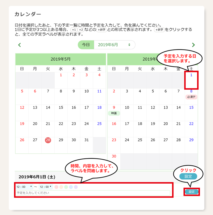 | 予定を入力したい日付をクリックすると、カレンダー下部の当日の予定一覧へ飛びます。 | |